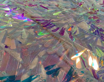 Tejido terciopelo elástico con lentejuelas, estampado multicolor, azul y blanco con tornasol