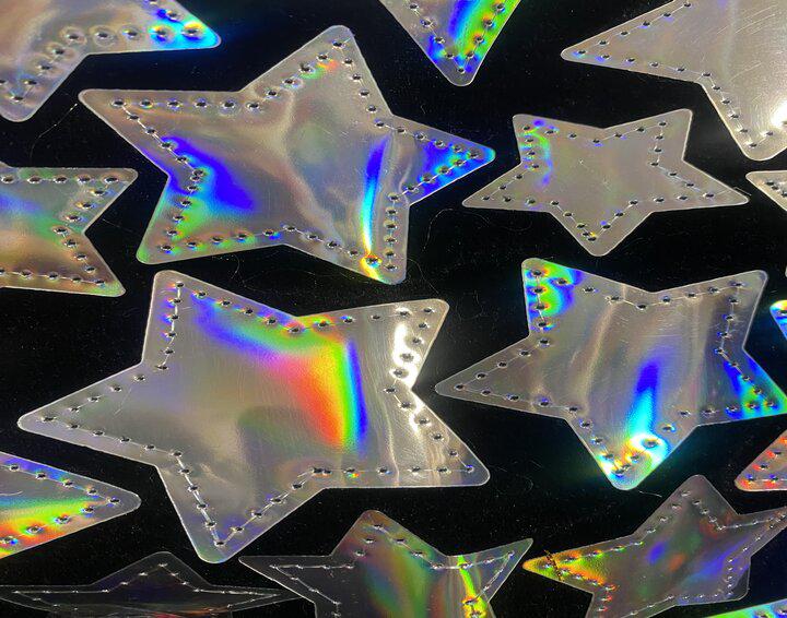 Tejido de terciopelo negro adornado con estrellas cosidas en color plata con tornasol